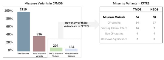 (left) Graphical representation of the total number of variants in CFMDB and the number of missense variants localized in TMD1 and NBD1. (right) Table indicating the number and classification of missense variants in CFTR2 (for a more detailed table, see Supplementary Table S1).