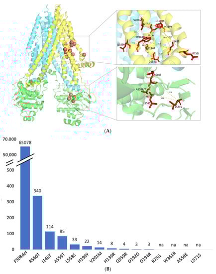 As missense variants tend to cluster in structural regions that appear particularly vulnerable to mutations (frequently termed hot-spot regions), we focused on variants that are relatively close among themselves. We selected 9 variants of TMD1—R75G, H139R, I148T, D192G, G194R, H199Y, V201M, W361R (T > A) and W361R (T > C)—with an average distance of 12 Å and 5 variants of NBD1—L558S, A559T, A559E, R560T and L571S—with an average distance of 8 Å (Figure 2A and Figure S1). All variants analyzed are rare, although with variable incidence (Figure 2B). Detailed information about the mutations analyzed is included as Supplemental Information.