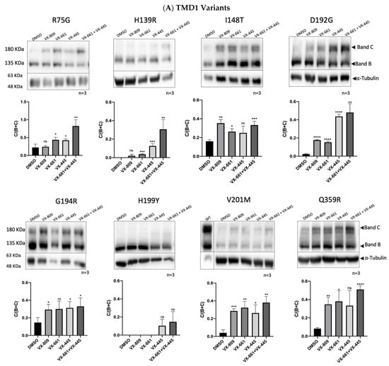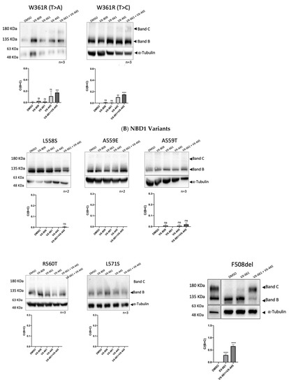 We assessed the impact of the variants on the expression and processing of CFTR and the efficacy of different small molecule compounds in the rescue of the CFTR mutants in the study. To accomplish this, mutations were introduced into full-length CFTR cDNA, which was used to stably transduce CFBE cells, and CFTR maturation was monitored by WB (Figure 3). Stably transduced CFBE cell lines were treated for 48 h with the following compounds: 3 µM VX-809/lumacaftor, 5 µM VX-661/tezacaftor, 3 µM VX-445/elexacaftor, with the combination of 5 µM VX-661 + 3 µM VX-445 and DMSO 0.1% (v/v) as a vehicle control. Total protein was extracted, and WB was used to assess the maturation status/rescue of CFTR containing these variants (Figure 3). CFTR trafficking was evaluated by the glycosylation status of two natural N-linked glycosylation sites in TMD2 which are core glycosylated in the ER (Band B) and then modified by complex glycosylation in the Golgi (Band C).