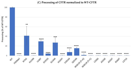 WB analysis of CFBE cells expressing CFTR variants after incubation with 0.1% DMSO (v/v), VX-809 (3 µM), VX-661 (5 µM) alone or in combination with VX-445 (3 µM) for 48 h. (A) TMD1 variants R75G-, H139R-, I148T-, D192G-, G194R-, H199Y, V201M-, Q359R-, W361R (T > A), W361R (T > C)-CFTR. (B) NBD1 variants L558S-, A559E-, A559T-, R560T- and L571S-CFTR. WT-CFTR control is shown close to V201M-CFTR. For each condition, densitometry was used to calculate the percentage of mature CFTR (Band C/Band B + Band C). Data are shown as mean ± SEM. Asterisks indicate significant differences compared with DMSO (p-value < 0.05, unpaired t-test). Images were acquired using ChemiDoc XRS+ imaging system BIO-RAD and further processed by Image Lab 6.0.1 software. (C) Processing of CFTR variants normalized to WT-CFTR. Asterisks indicate significant differences compared to WT-CFTR. * p-value < 0.05; ** p-value < 0.01; *** p-value < 0.001; **** p-value < 0.0001 (two-tailed unpaired Student’s t-test).