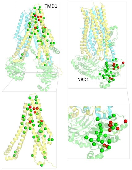 Considering that 168 missense mutations are eligible for treatment with Trikafta—61 in TMD1, 32 in NBD1, 41 in TMD2, and 18 mutations in NBD2 (Supplementary Table S1), we mapped on CFTR structure all the missense mutations listed in CFTR2 classified as responders (green spheres) or non-responders (red spheres) according to their eligibility for Trikafta (Figure 5 and Supplementary Table S2) to determine if the structural pattern in Figure 4 (for the mutations we studied) could be part of a more extended pattern of response.