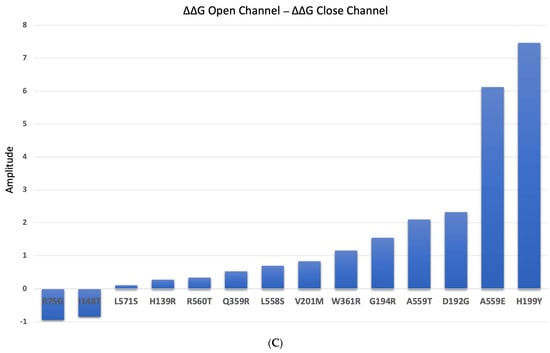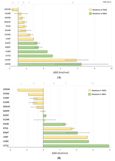 Figure 8A shows that, overall, there is a gain in predicted energy stability in the presence of VX-661 for V201M, H139R, Q359R, G194R, A559T and A559E and a loss of predicted stability for W361R, R75G, D192G, I148T, R560T, L558S, L571S and H199Y—as shown in the changes represented in Figure 8B. For TMD1 mutations, predicted ΔΔG energies have a small decrease from 1.42 kcal/mol to 1.28 kcal/mol, which means a minor gain in stability (Supplementary Table S3). NBD1 mutations have similar behavior, since predicted ΔΔG energies decrease from 3.92 kcal/mol to 3.28 kcal/mol (Supplementary Table S3).