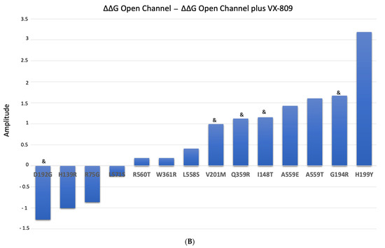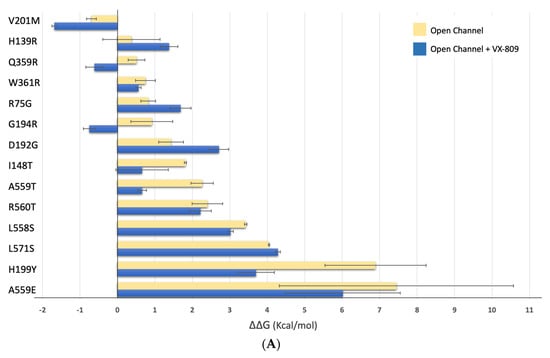 Energy prediction of ΔΔG (kcal/mol) of CFTR mutants in the presence and absence of VX-809 calculated with FoldX [29]. (A)—yellow bars: human CFTR bound to phosphorylated ATP (6msm)—“open” conformation [28], (similar to Figure 6A); blue bars: human CFTR + Mg/ATP + VX-809 (pdb:7svd) [22]; bars are presented as mean ± standard deviation. (B)—Variation of ΔΔG (kcal/mol) for CFTR variants calculated as the difference between the ΔΔG “open” and the ΔΔG “open” in the presence of VX-809. “&” corresponds to variants in which band C is present.
