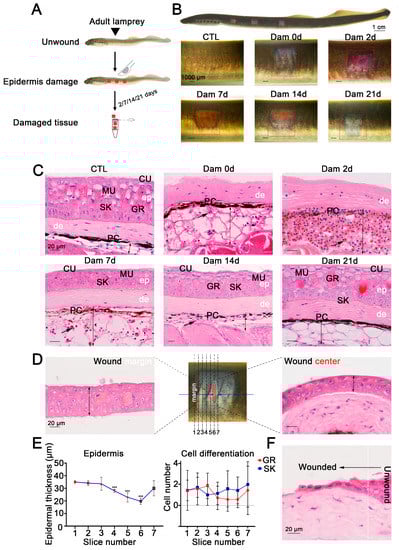 Adult lampreys (Lethenteron reissneri, body length: 15 cm ± 1 cm) were obtained from Huanren Manchu Autonomous County, Benxi, Liaoning Province, China. The lampreys were then maintained in an aquarium at 4 °C. All lamprey handling and experimental procedures were approved by the Animal Welfare and Research Ethics Committee of the Institute of Dalian Medical University. For the epidermal regeneration challenge, adult lampreys (N = 30) were divided randomly into five groups: no wound (CTL), 0 days after damage (Dam 0 d), 2 days after damage (Dam 2 d), 7 days after damage (Dam 7 d), 14 days after damage (Dam 14 d), and 21 days after damage (Dam 21 d). After anesthetization with 0.05% MS-222 (tricaine methanesulfonate, Sigma–Aldrich, E10521, St. Louis, MO, USA), the body surface was scraped using a sterilized scalpel to create a wound bed (1.5 cm × 0.5 cm) until no more mucoid tissue could be scraped. The whole process was performed gently to minimize damage to the dermis. For full-thickness damage, a scalpel with only a 5-mm blade exposed was used to make a 0.5-cm-long wound on the side of the lamprey parallel to the body. Images were captured with a zoom stereo microscope (SMZ1500, Nikon, Japan).