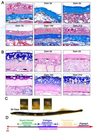 Electron microscopy [9,10,11,12] and conventional histology [14] results have shown that the skin structure of sea lamprey is relatively conserved, and the same is true of Lethenteron reissneri. However, to the best of our knowledge, the repair process remains unknown, and we gently scraped the lamprey epidermis to damage it. The lamprey skin tissue injury and sampling collection processes are shown in Figure 1A. To clarify the processes of lamprey skin injury and healing, we recorded the healing characteristics at different times after skin injury (Figure 1B). At the onset of injury (0 days after damage, Dam 0 d), the color of the adult lamprey dermis was nearly blue. In addition, the subcutaneous adipose layer with hyperemia was locally dilated with a small number of red blood cells (RBCs) and inflammatory cells, the melanocytes were gradually dispersed, and some adipocytes had disappeared. At 2 days after injury, the entire wound was congested, the subcutaneous fat layer was further expanded and filled with a large number of RBCs and granulocytes and melanocytes had migrated to the bottom of the hyperemic region. On the 7th day after injury, the subcutaneous fat layer of the wound was reduced, a small number of granular and skein cells appeared in the regenerated epidermis, and the migration of melanocytes was reduced. At 14 days after injury, the hyperemia had further subsided, the degree of cell differentiation in the regenerated epidermis was high, the melanocytes had migrated back to the dermis, the number of infiltrating cells was reduced, the thickness of the subcutaneous fat layer was significantly reduced and white adipocytes had reappeared. At 21 days, epidermal damage could still be observed, but the thickness of the epidermis was consistent with that of undamaged skin, no obvious boundary with the undamaged epidermis was detected and the organization was similar to that of undamaged skin (Figure 1C). We compared the processes of skin injury and healing between adult and larval lampreys, and the results showed that larval lampreys were more hyperemic (Figure S1). In addition, our results revealed that deep damage could delay the healing process (Figures S1 and S2).