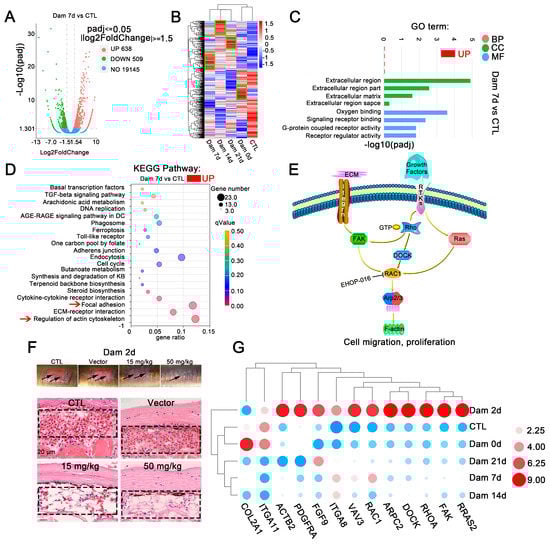 RNA-seq results of lamprey epidermis and dermis tissue after skin damage. (A) Volcano plot of the differentially expressed genes (DEGs) after skin damage in lampreys. (B) In the cluster expression analysis, the DEGs changed at different time points (green box). (C) GO functional category analysis. (D) KEGG pathway classification analysis and the DEGs involved in the main pathway; the red arrow indicates major signaling pathways. (E) The main DEGs eventually induced high expression of F-actin, changed the cytoskeleton, responded to mechanical injury and induced cell migration. (F) Early effect of the addition of the Ehop-016 inhibitor. Scale bars, 20 μm. (G) Thirteen genes related to regulation of the actin cytoskeleton and focal adhesion kinase were associated with significant changes in two signaling pathways related to focal adhesion kinase. DC: diabetic complication; KB: ketone bodies.