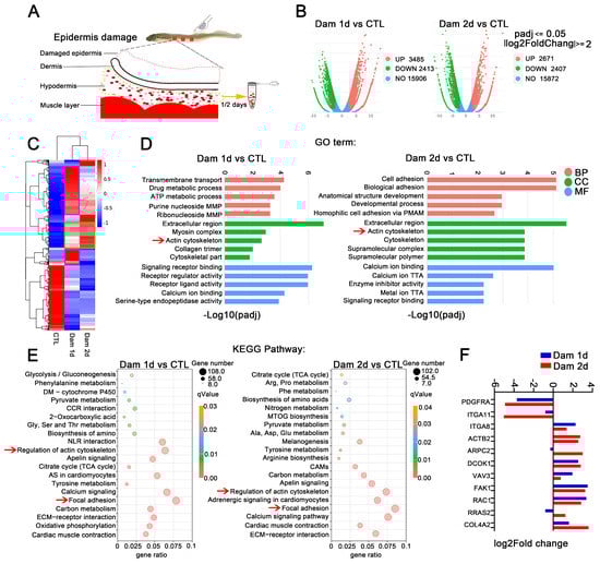 RNA-seq analysis of the hypodermis after epidermal damage. (A) Schematic diagram of hypodermis transcriptome sampling after epidermal damage. (B) Volcano plot of the differentially expressed genes (DEGs) in lampreys after skin damage. (C) Cluster expression analysis. Shared DEGs (green box) and unique DEGs (purple box) were found at the two time points. (D) GO functional category analysis. (E) KEGG pathway classification analysis; the red arrow indicates major signaling pathways. (F) Expression of selected genes in the subcutaneous fat layer. MMP: monophosphate metabolic process; PMAP: plasma membrane adhesion protein; TTA: transmembrane transporter activity; DM: drug metabolism; CCR: cytokine−cytokine receptor; NLR: neuroactive ligand−receptor; AS: adrenergic signaling; CAMs: cell adhesion molecules; MTOG: mucin type O−glycan. The yellow arrow means to receive samples one day and two days later. The red arrow is to better notice the key signal pathway.