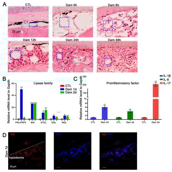 Functional analysis of red blood cells (RBCs) and adipocytes after epidermal damage. (A) H&E staining of RBC infiltration in the subcutaneous adipose layer after damage; lipolysis of adipocytes (blue box), gradual infiltration of RBCs (black arrow). Scale bars, 20 μm. (B) The significantly changed lipase genes in the RNA-seq data were verified by RT–PCR. (C) Results of RT–PCR analysis of proinflammatory factors in RBCs. * p < 0.05 versus CTL, ** p < 0.01versus CTL, *** p < 0.001 versus CTL. (D) EdU proliferation staining results of infiltrating cells in the subcutaneous fat layer. Scale bars, 20 μm.