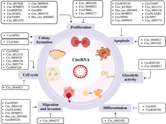 Schematic representation of the biological role of circular RNAs (circRNAs) in proliferation, apoptosis, glycolytic activity, differentiation, migration and invasion, cell cycle regulation and colony formation. Figures were created with BioRender.com.