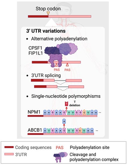 Other than distinct species of ncRNAs, mRNAs comprise central protein-coding regions flanked by non-coding 5’ and 3’ untranslated regions (UTRs) that control key facets of mRNA post-transcriptional processing and have been shown to play important roles in AML pathogenesis. Moreover, most mammalian genes generate mRNAs with alternative 3’UTRs via processes such as alternative polyadenylation (APA) [] and 3’UTR splicing []. The occurrence of 3'UTR APA takes place due to the existence of multiple polyadenylation signals (PASs) within the same transcript and results in differential sequence information at the 3’ end. It is regulated by various cis-regulatory elements such as the PAS, which generally has a consensus sequence of AAUAAA or other similar sequence variants. As the PAS recruits cleavage and polyadenylation specificity factors (CPSFs), which are trans-regulators, it initiates the 3’UTR cleavage and polyadenylation process. As 3’UTRs are frequently associated with RBPs, lncRNAs and miRNAs that act as post-transcriptional regulators, APA-mediated changes in 3’UTR lengths can result in differential mRNA stability, translational efficiency and protein localization []. Furthermore, 3’UTRs also undergo splicing, which may affect transcript localization and the availability for translation []. Apart from that, specific pre-existing genetic abnormalities may predispose susceptible individuals to develop AML. A study by Brandsma et al. (2021) showed that differing mutational signatures could impact patient survival outcomes in pediatric AML []. Specifically, in the non-coding regions, single nucleotide polymorphisms (SNPs) are commonly observed, where 90% of single nucleotide polymorphisms (SNPs) are found in non-coding regions [,]. SNPs affecting the UTRs can potentially influence gene expression and cause cancer [].