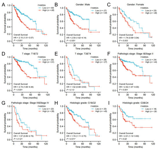 | FAM50A (High vs. Low) | 2.153 (1.508–3.072) | <0.001 | 2.272 (1.424–3.627) | <0.001 |