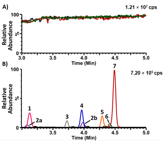 Matrix effect evaluation for the analysis of lyso-Gb3 and its analogues in dried blood spots (DBSs). (A). Signal obtained from the post-column infusion of lyso-Gb3-13C6 (500 nM in: 50% acetonitrile, 49.9% H2O, 0.1% formic acid) at a flow rate of 10 µL/min during the UHPLC injection of: (1) the resuspension solvent (50% acetonitrile, 49.9% H2O, 0.1% formic acid) (green line); (2) a Whatman-GE 903-collected DBS prepared with control blood (post-sample preparation, red line); and (3) a Capitainer®B-collected DBS prepared with control blood (post-sample preparation, black line). (B). Multiple reaction-monitoring (MRM) analysis of lyso-Gb3 and its analogues in a Whatman-GE 903-collected DBS prepared with blood from an untreated Fabry male; 1: analogue (+16 Da); 2a and 2b: (analogue (+34 Da); 3: analogue (−28 Da); 4: analogue (−2 Da); 5: lyso-Gb3-Gly (internal standard); 6: analogue (+18 Da); and 7: lyso-Gb3). cps = counts per second.