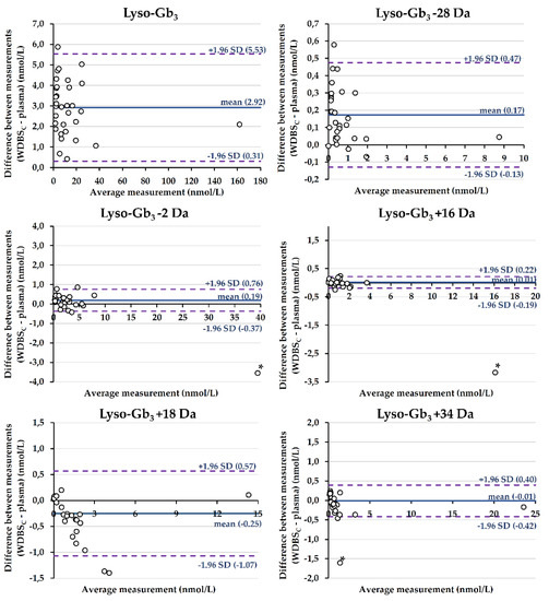 Bland–Altman analyses between lyso-Gb3 and related analogue measurements in plasma and in DBSs collected using Whatman-GE 903 filter papers (capillary blood) (n = 32 participants). Mean differences are shown by solid lines, while the dashed lines represent the limits of agreement. For lyso-Gb3 −2 Da, lyso-Gb3 +16 Da, and lyso-Gb3 +34 Da, an outlier (*) was excluded from the calculations of the mean difference and 95% limits of agreement.