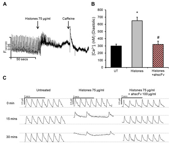 Histones increase intracellular calcium concentrations and disturb calcium dynamics in cardiomyocytes. (A) Changes in intracellular calcium concentrations [Ca2+]i in HL-1 cardiomyocytes following histone (75 µg/mL) treatment as recorded using florescence photometry with Fura-2AM as a Ca2+ indicator. Upper edge of the trace represents systolic [Ca2+]i and bottom edge represents diastolic [Ca2+]i. Caffeine (10 mM) was used as a positive inducer of Ca2+ release from sarcoplasmic reticulum stores. n = 4. (B) Diastolic levels of [Ca2+]i recorded 1 min after treatment with culture medium (untreated “UT”), histones 75 µg/mL (histones) and histones 75 µg/mL + anti-histone antibody 100 µg/mL (histones + ahscFv). n = 4. * p < 0.05 as compared to UT, # p < 0.05 as compared to histone treatment. (C) Representative traces of Ca2+ waves over time in untreated cells and in cardiomyocytes treated with histones 75 µg/mL ± ahscFv 100 µg/mL. Solid horizontal bar represents a time duration of 2 s. Dotted horizontal bars represent systolic (upper line) and diastolic (bottom line) [Ca2+]i in baseline untreated cardiomyocytes. n = 9.