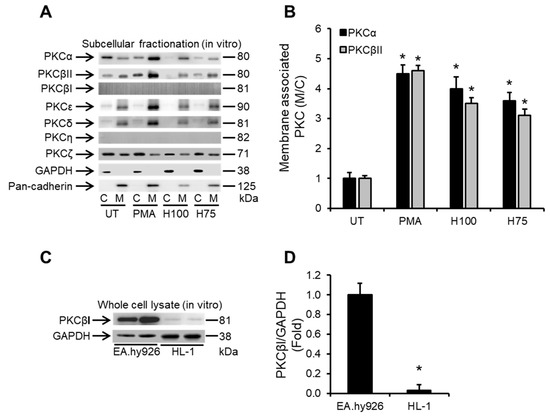 Histones induce the translocation of PKCα and PKCβII from the cytosolic to membrane fractions of cardiomyocytes. (A) Western blots illustrating the cytosolic “C” to membrane “M” distribution of protein kinase C (PKC) α, PKCβII, PKCβI, PKCε, PKCδ, PKCη and PKCζ in HL-1 cardiomyocytes in untreated conditions (UT) or following 30 min of treatment with histones at 75 and 100 µg/mL (H75 and H100, respectively). Phorbol myristate acetate (PMA) was used as a positive inducer of PKCα and PKCβII activation (i.e., translocation from C to M fractions of cardiomyocytes). GAPDH and pan-cadherin were used as markers of C and M fractions, respectively. n = 4. (B) Band-quantification histogram illustrating the cytosolic “C” to membrane “M” distribution of PKCα and PKCβII. n = 4. * p < 0.05 as compared to UT. (C) Western blots illustrating the level of expression of PKCβI in whole cell lysates from HL-1 cardiomyocytes and EA.hy926 endothelial cells. GAPDH was used as a loading control. (D) PKCβI/GAPDH ratios from band-quantification, n = 3. * p < 0.05 as compared to EA.hy926.