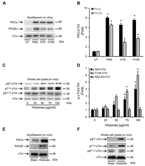 Specifically, there was histone-induced dose-dependent phosphorylation of cTnI at the PKC-regulated residues (S43 and T144) (Figure 3C). Phosphorylation levels were significantly higher when HL-1 cardiomyocytes were exposed to 75 and 100 µg/mL histones compared to untreated cells (Figure 3D). Histone treatment did not influence the phosphorylation of cTnI at the protein kinase A (PKA)-regulated residue (S23.S24) (Figure 3C,D). Importantly, intravenous injection of histones into mice at a concentration of 30 mg/kg (resulting in circulating histone concentrations of approximately 65.5 ± 13.4 µg/mL) [26], that causes direct LV dysfunction [26], resulted in enhanced PKCα and PKCβII association with cardiac myofilaments (Figure 3E) and also substantial induced cTnI phosphorylation at the PKC-regulated sites (S43 and T144) in murine cardiomyocytes (Figure 3F). Histone treatment did not influence the phosphorylation of cTnI at the protein kinase A (PKA)-regulated residue (S23.S24) in vivo (Figure 3F).