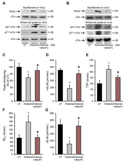 Anti-histone antibody abrogates histone-induced cTnI phosphorylation and improves cardiomyocyte contractility. (A) Upper panel: representative Western blots of the myofilament (triton-insoluble) fraction of HL-1 cardiomyocytes illustrating the levels of myofilament-associated PKCα in untreated cells (UT) or 30 min after treatment with histones at 75 µg/mL ± 100 µg/mL anti-histone antibody (ahscFv). Cardiac troponin I (cTnI) was used as a marker of the myofilament fraction of HL-1 cardiomyocytes and a loading control. n = 4. Bottom panel: representative Western blots illustrating the effects of the anti-histone antibody (100 µg/mL) on histone-induced cTnI phosphorylation at the PKC-regulated phosphorylation residues (S43 and T144) in HL-1 cardiomyocytes. Specific antibodies against phosphorylated cTnI at S43 (pS43-cTnI) and T144 (pT144-cTnI) were used. cTnI (total) was used as a loading/endogenous control. n = 4. (B) Upper panel: Representative Western blots of the myofilament (triton-insoluble) fraction of murine cardiomyocytes illustrating the levels of myofilament-associated PKCα in saline-infused mice (Sham) or 60 min after histones intravenous (i.v.) infusion at 30 mg/kg ± 10 mg/kg anti-histone antibody (ahscFv). Cardiac troponin I (cTnI) was used as a marker of the myofilament fraction of HL-1 cardiomyocytes and a loading control. n = 4. Lower panel: Representative Western blots illustrating the effects of anti-histone antibody on histone-induced cTnI phosphorylation at the PKC-regulated phosphorylation residues (S45 and T144) in murine cardiomyocytes. Specific antibodies against phosphorylated cTnI at S45 (pS45-cTnI) and T144 (pT144-cTnI) were used. cTnI (total) was used as a loading/endogenous control. n = 4. (C–G) Effects of histones (75 µg/mL) ± 100 µg/mL anti-histone antibody (ahscFv) on peak shortening (untreated “UT” cardiomyocyte level set to 100%), maximum velocity of shortening (+dL/dt), time to peak shortening (TTP), time to 90% re-lengthening (tR90) and maximum velocity of re-lengthening (−dL/dt). n = 9. * p < 0.05 as compared to UT, # p < 0.05 as compared to histone treatment.