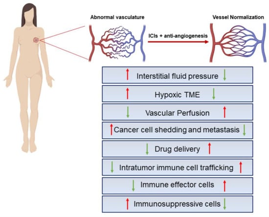 Key effects of IC blockers combined with antiangiogenics. Structural and functional abnormalities of tumor blood vessels lead to impaired blood flow and perfusion, hypoxic TME, limited drug delivery to the tumor, increased invasiveness of tumor cells, enhanced tumor infiltration of immunosuppressive cells, and impaired antitumor immune responses. ICI administration in combination with antiangiogenic factors may subvert this scenario in support of an immunosupportive BC-TME. The red and green arrows represent the indicated hyper-activated or down-modulated cellular processes, respectively. The figure was created with BioRender.com.