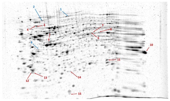 The proteomes of the transfected cells were subjected to 2D-DIGE analysis. After separation, the gels were scanned, followed by image analysis. After warping, the fused image containing spots from all Cy-dye labeled gels was generated. In total, 339 spots were detected. Statistical analysis revealed 15 spots showing statistically significant differences between SARS-CoV-2 Mpro and mock-transfected samples. As compared to the control, only three spots showed decreased intensity (ratio: 0.49–0.87), the other spots had increased intensity (ratio: 1.43–3.96) in the SARS-CoV-2 Mpro-transfected samples (Figure 2). Proteins identified in the spots and excised from the gel are listed in Table 1.