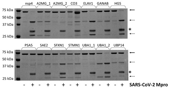 The 2D-DIGE analysis revealed changes in the levels of proteins that were predicted to contain no cleavage sites of Mpro (Table 1), or their candidate cleavage site sequence were not cleaved in vitro (Figure 3). The observed changes in the protein levels were considered to be caused by the expression of SARS-CoV-2 Mpro rather than by the transfection itself since an empty pcDNA3.1 vector transfected the control cells. Although expression of the recombinant Mpro may have affected the levels of multiple cellular proteins, we assumed that changes in the cellular proteome could not be interpreted exclusively at the level of Mpro expression since the changes induced by the virions are more complex due to the predisposition of the infected cells to the complete set of viral proteins [59,60].