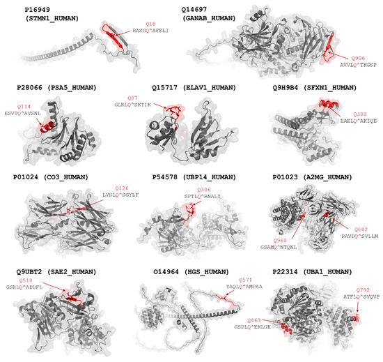 Structures of potential proteolytic targets of SARS-CoV-2 Mpro. Cleavage sites that were identified using NetCorona 1.0 web server are highlighted in red. P1 Gln residues of the cleavage sites are represented by sticks and shown by the arrows. Predicted cleavage probabilities are shown in Table 1.