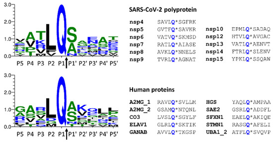 Comparison of cleavage site sequences. Autoproteolytic cleavage sites of SARS-CoV-2 polyprotein are shown, and the cleavage sites of Mpro identified in this work are also represented. The cleavage site sequences (P5-P5′ residues) of the viral polyprotein are shown based on Miczi et al. [12], and the sequences of human proteins are based on this study. The sequence logos were prepared using Weblogo 3.7.11 web server [31]. The arrows indicate the cleavage position between the P1 and P1′ residues.