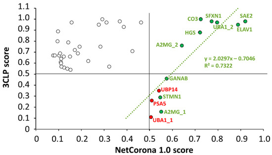 The results of the sequence-based in silico analyses were correlated, and a linear regression analysis of the scores obtained by the NetCorona or 3CLP online tools was performed (Figure 7). Only those sites were included in the analysis for which a >0.5 score was calculated either by NetCorona or 3CLP methods, or both. Linear regression analysis revealed no direct correlation between scores if all data points were included (R2 = 0.0195), while we observed good correlation (R2 = 0.7322) if such sites were analyzed that had >0.5 NetCorona and 3CLP scores and were cleaved by SARS-CoV-2 Mpro in vitro (Figure 3). Interestingly, none of the sites having a <0.6 NetCorona score were predicted as potential cleavage sites by the 3CLP algorithm. In contrast to this, 3CLP predicted high cleavage probability for multiple sites for which a considerably lower NetCorona score (<0.5) was obtained, i.e., for sites that were not identified as potential cleavage sites by NetCorona (Figure 3). For example, in the case of complement C3 (CO3) protein, the 3CLP and NetCorona algorithms identified 8 and 1 potential cleavage sites, respectively (Table 1). The average scores predicted for the seven different sites were 0.749 (3CLP) and 0.174 (NetCorona), indicating that the different methods may identify the same SARS-CoV-2 Mpro sites with considerably different likelihood. There were six cleavage sites that had >0.5 NetCorona and <0.5 3CLP scores (Figure 7). Three of these sites were proved to be cleaved by SARS-CoV-2 Mpro, while the other three were not processed in vitro. This implies that sites having NetCorona scores close to the 0.5 thresholds (between 0.50–0.55) can be identified with relatively lower reliability (e.g., PSA5, UBP14, and UBA1_1).