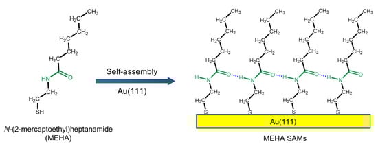 MEHA was simply synthesized by the reaction of heptanoic acid (Sigma Aldrich, St.Louis, MO, USA) and 2-aminoethanethiol (Tokyo Chemical Industry, Tokyo, Japan) according to a reported literature method [] and was confirmed via 1H NMR. DT [CH3(CH2)9SH] was purchased from Tokyo Chemical Industry, Japan. The synthetic details can be found in the Supporting Information (Figures S1 and S2). Single-crystal Au(111) substrates for SAMs were prepared by the thermal deposition of gold on mica under UHV conditions of ~10−6 Pa at 623 K [].