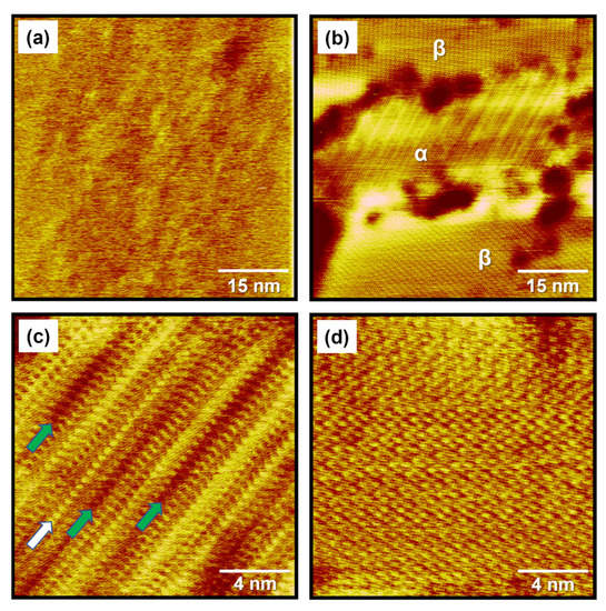 After deposition for 1 min, the STM image in Figure 2a shows that there is no observable structural order of MEHA SAMs over the entire Au(111) surface. It was attributed to the formation of a liquid phase on Au(111) that has often been observed at a low surface coverage during the initial growth stage of alkanethiolate SAMs at a low surface coverage prior to the formation of a condensed phase [,,]. This result is strongly supported by our XPS and CV results (discussed later). However, when the deposition time increased from 1 to 10 min, the surface structures of MEHA SAMs on Au(111) drastically changed from the liquid phase to the 2D ordered phase, as shown in Figure 2b–d. Interestingly, we found the coexistence of two structural phases: an ordered row structure (α-phase) and well-ordered and closely packed structure (β-phase), as shown in Figure 2b. In addition, several vacancy islands (VIs) with a monatomic depth of 2.5 Å (dark trench areas) were observed on the surface, which were well-known intrinsic characteristics that appeared as a result of the formation of chemisorbed monolayers on Au(111) surfaces by the adsorption of S- or Se-containing molecules [,,,,,,,,,]. Note that the VIs were also fully covered with a monolayer, not a bare Au(111) surface, as already demonstrated via high-resolution STM observations for thiolate or selenolate SAMs on Au(111) [,,]. It was found that most VIs on the Au(111) surfaces existed near domain boundaries between the α- and β-phases. This result implied that the movement of VIs to domain boundary regions was driven by the optimization of van der Waals interactions between molecular backbones in the ordered domains. The high-resolution STM image in Figure 2c shows that the α-phase was composed of ordered molecular rows with various imaging contrasts; there were no periodic patterns between the rows. Therefore, we were not able to assign adlayer structures corresponding to the α-phase. The distance between molecular spots along the row indicated by the white arrow was measured to be 5.1 ± 0.2 Å, which was ~√3 times against the diameter of Au atom with a 2.89 Å. Several dark rows indicated by green arrows were also observed, which were considered to be missing rows. Similar structures usually appeared prior to the formation of closely packed SAMs [,] or after the desorption of adsorbed molecules in the closely packed SAMs resulting from thermal annealing [,] or long-term storage in pure solvent [] and UHV conditions []. Therefore, the α-phase was considered to be an intermediate phase that could appear before the formation of closely packed monolayers. The STM image in Figure 2d shows a closely packed and well-ordered β-phase of MEHA SAMs on Au(111). After a longer deposition for 1 h, we observed the same β-phase with much better STM resolution (Figure 3b). Therefore, structural details for this phase will be discussed later. From our STM results showing the existence of two mixed phases (the α- and β-phases) on Au(111), it was clear that a deposition time of 10 min was not sufficient for the formation of a uniform well-ordered phase for MEHA SAMs.