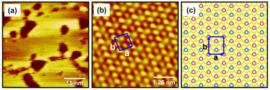(a) STM image of MEHA SAMs on Au(111) formed in 0.01 mM EtOH at RT for 1 h. (b) High-resolution STM image of the well-ordered β phase of MEHA SAMs on Au(111). (c) A proposed structural model of MEHA SAMs on Au(111). Scan sizes of STM images were (a) 60 × 60 nm2 and (b) 5 × 5 nm2. Imaging conditions: (a) Vb = 620 mV and It = 550 pA and (b) Vb = 280 mV and It = 725 pA.