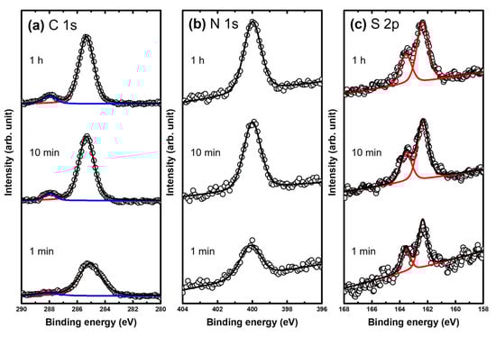 The (a) C 1s, (b) N 1s, and (c) S 2p regions of the XPS spectra of MEHA SAMs on Au(111) formed in 0.01 mM EtOH solution at RT for 1 min, 10 min, and 1 h. The dark lines correspond to the normalized XPS peaks and the colored lines correspond to the fitted XPS peaks.