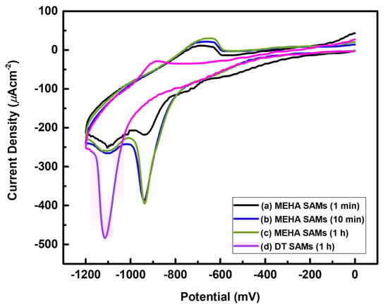 It has been reported that the position and shape of RD peaks for SAM-covered Au electrodes were significantly influenced by the binding affinity between the anchoring group and the Au surface, the magnitude of van der Waals interactions between adsorbed molecules, and the degree of structural order of the SAMs [,,,,,]. To examine the electrochemical behavior of MEHA SAMs formed at different deposition times on Au(111), we measured the CVs of RD for MEHA SAM-modified Au electrodes, as shown in Figure 5. Moreover, to understand the effect of an internal amide group in MEHA SAMs with regard to electrochemical behavior, we also measured the CVs of RD for DT SAM-modified Au electrodes prepared in a 0.01 mM EtOH solution at RT for 1 h (Figure 5). We found that the RD behavior of MEHA SAMs formed after deposition for 1 min was markedly different from those that formed after deposition for 10 min and 1 h, as shown in Figure 5a–c. Two RD peaks for MEHA SAMs formed after deposition for 1 min were observed at around −935 and −1102 mV, whereas those for MEHA SAMs formed after deposition for 10 min and 1 h were observed at around −940 and −1104 mV. The first RD peak MEHA SAMs, as a main peak that formed after deposition for 10 min and 1 h, were shifted to a slightly more negative potential with sharp and strong intensities compared to that formed after deposition for 1 min (broad and weak intensity). This remarkable difference in electrochemical behavior should be due to the formation of highly ordered MEHA SAMs resulting from an increase in surface coverage, as demonstrated by our STM and XPS study. It was demonstrated that, when van der Waals interactions in the SAMs increased, the structural quality of the SAMs was significantly enhanced. Hence, RD peaks were also shifted to a more negative potential [,,,,,]. Moreover, similar second RD peaks with a broad hump between −1070 and −1130 mV were observed for all SAM samples regardless of deposition time. Although it is difficult to exactly assign the origin of this peak at present, it was proposed that similar peaks with broad humps were probably due to the desorption of sulfur atoms on Au surfaces resulting from S–C bond cleavage during electrochemical reactions or caused by the adsorption of sulfur impurities present in the thiol solution [].