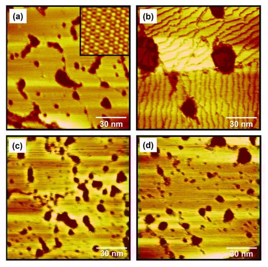 (a,b) STM images of pre-covered DT SAMs on Au(111) formed in 0.01 mM EtOH solution at RT for 1 h (a) before and (b) after thermal annealing at 373 K for 1 h. The high-resolution inset STM image (5 × 5 nm2) in Figure 6a shows that DT SAMs have a (3 × 2√3) packing structure. (c,d) STM images of MEHA SAMs on Au(111) formed in 0.01 mM EtOH solution at RT for 1 h (c) before and (d) after thermal annealing at 373 K for 1 h. Scan sizes of all STM images were 120 × 120 nm2, respectively. Imaging conditions: (a) Vb = 560 mV and It = 300 pA, (b) Vb = 500 mV and It = 350 pA, (c) Vb = 610 mV and It = 450 pA, and (d) Vb = 500 mV and It = 550 pA.