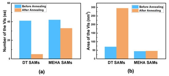 A diagram showing a remarkable difference in the (a) number and (b) area of VIs to the total surface area for DT and MEHA SAMs before and after thermal annealing.