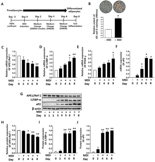 To determine the changes in APE1/Ref-1 expression during the adipogenic differentiation of preadipocytes, we investigated APE1/Ref-1 expression on days 0, 2, 4, 6, and 8 of 3T3-L1 cell differentiation (Figure 1A). Differentiation of 3T3-L1 cells to mature adipocytes was induced using differentiation medium MDI for 8 days and was confirmed by staining with Oil Red O (Figure 1B). The mRNA expression of APE1/Ref-1 decreased by 58% from days 4 to 8 in a time-dependent manner during differentiation (Figure 1C), whereas the mRNA levels of adipocyte differentiation markers (C/EBP-α, PPAR-γ, and aP2) in MDI-treated cells were significantly elevated compared to those in the untreated cells (Figure 1D–F). Next, we investigated the protein expression of APE1/Ref-1, C/EBP-α and aP2 using Western blotting. As shown in Figure 1G, the protein level of APE1/Ref-1 showed the same decreasing tendency as the mRNA level of APE1/Ref-1 during adipocyte differentiation (Figure 1H); however, the protein levels of C/EBP-α and aP2 increased from days 4 to 8 after differentiation, which was inversely proportional to APE1/Ref-1 protein expression (Figure 1I,J). These results indicate that APE1/Ref-1 expression was reduced during adipocyte differentiation in 3T3-L1 cells. Therefore, it is suggested that downregulation of APE1/Ref-1 may play an important role in adipocyte differentiation.