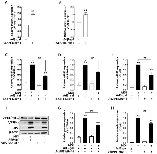 To evaluate the effect of APE1/Ref-1 on MDI-induced adipocyte differentiation, 3T3-L1 cells were transfected with adenovirus expressing APE1/Ref-1. The cells were pretreated with adenovirus expressing β-gal or adenovirus expressing APE1/Ref-1 for 24 h, and adipocyte differentiation was induced using MDI for the subsequent 8 days. In adenoviral APE1/Ref-1-transfected cells, APE1/Ref-1 was overexpressed at both mRNA and protein levels, as detected using qRT-PCR and Western blotting, respectively (Figure 2A,B). The mRNA levels of C/EBP-α, PPAR-γ, and aP2 increased in MDI-induced 3T3-L1 cells, but overexpression of APE1/Ref-1 significantly suppressed the increased C/EBP-α, PPAR-γ, and aP2 mRNA levels (Figure 2C–E). We then investigated the protein expression in AdAPE1/Ref-1-transfected 3T3-L1 cells using Western blotting (Figure 2G). The protein expression of both C/EBP-α and aP2 was significantly enhanced in the MDI-treated group (Figure 2F); however, overexpression of APE1/Ref-1 reduced the expression of C/EBP-α and aP2 in MDI-induced 3T3-L1 cells, indicating that APE1/Ref-1 exerted an inhibitory effect on adipocyte differentiation (Figure 2G,H). These results indicate that APE1/Ref-1 overexpression inhibits adipocyte differentiation by suppressing the expression of adipocyte transcription factors such as C/EBP-α or PPAR-γ.