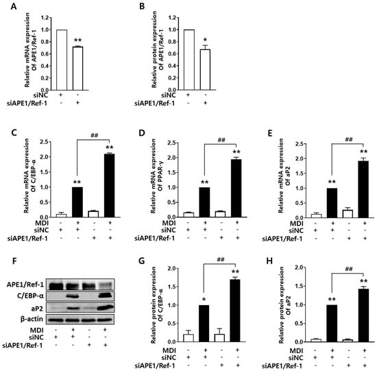 Having established that overexpression of APE1/Ref-1 suppressed adipocyte differentiation, the effect of gene silencing of APE1/Ref-1 during MDI-induced adipocyte differentiation was evaluated in 3T3-L1 cells with transfection of APE1/Ref-1 siRNA. APE1/Ref-1 siRNA-transfected cells were exposed to 50 nM for 24 h, and the control group cells were treated with negative control siRNA at the same concentration. Adipocyte differentiation was induced using MDI for 8 days. As shown in Figure 3A,B, the cells transfected with siAPE1/Ref-1 showed significantly reduced mRNA and protein expression of APE1/Ref-1. The expression of APE1/Ref-1 was confirmed to be the lowest in the group induced with MDI following transfection of siAPE1/Ref-1 into 3T3-L1 cells. As shown in Figure 3C–E, silencing APE1/Ref-1 significantly increased the mRNA levels of C/EBP-α and PPAR-γ. As shown in Figure 3G,H APE1/Ref-1 silencing also induced upregulation of C/EBP-α and aP2 at the protein level. These results suggest that APE1/Ref-1 silencing promotes adipocyte differentiation of 3T3-L1 cells.