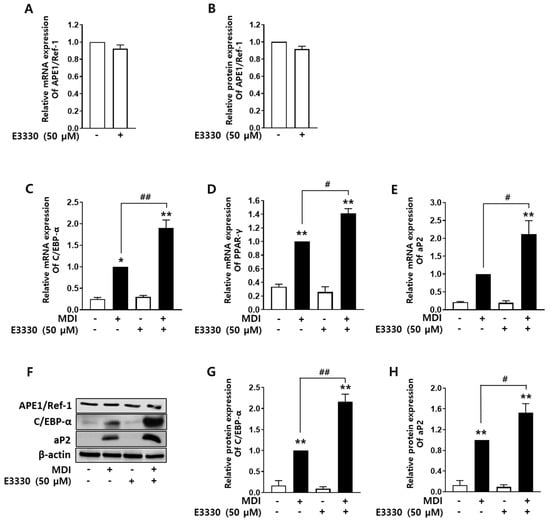Redox inhibition of APE1/Ref-1 increased adipocyte differentiation of 3T3-L1 cells. To inhibit the redox activity of APE1/Ref-1, the cells were incubated with 50 µM E3330 for 24 h before differentiation induction using the MDI cocktail. (A,B) E3330 did not affect the mRNA and protein levels of APE1/Ref-1. (C–E) The mRNA levels of C/EBP-α, PPAR-γ, and aP2 were increased with the redox inhibition of APE1/Ref-1 using E3330 in differentiating adipocytes. (F) Representative Western blot results of aP2, C/EBP-α, and APE1/Ref-1 protein levels upon redox inhibition of APE1/Ref-1 using E3330 in differentiating adipocytes. (G,H) Protein levels of C/EBP-α and aP2 increased upon redox inhibition of APE1/Ref-1 expression using E3330 in differentiating adipocytes. The graph shows the average band intensity normalized to β-actin level. The relative mRNA and protein levels of C/EBP-α, PPAR-γ, and aP2 were calculated compared with those in cells cultured in MDI alone. The results are represented as mean ± SEM; * p < 0.05, ** p < 0.01 vs. basal level; # p < 0.05, ## p < 0.01 vs. MDI alone denotes statistically significant differences using the one-way ANOVA followed by Bonferroni’s multiple comparison test.