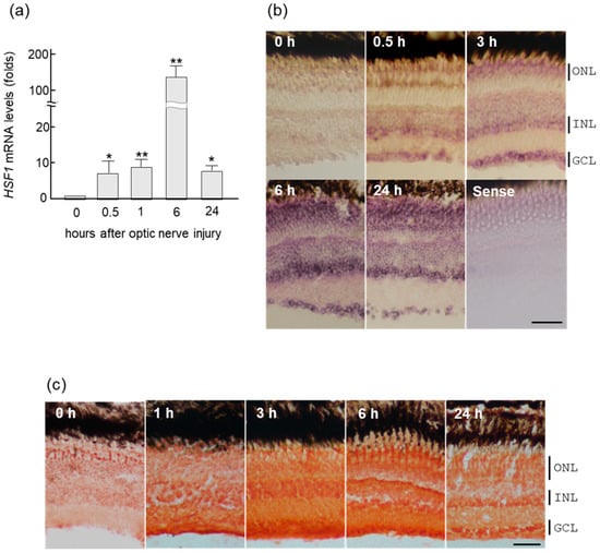 We performed real-time PCR using gene-specific primers to examine how the expression of the HSF1 gene changes in the retina after optic nerve crush. The upregulation of HSF1 mRNA started at 0.5 h after ONI, peaked at 6 h, and decreased at 24 h (Figure 1a). However, HSF1 expression was still significantly higher at 24 h.