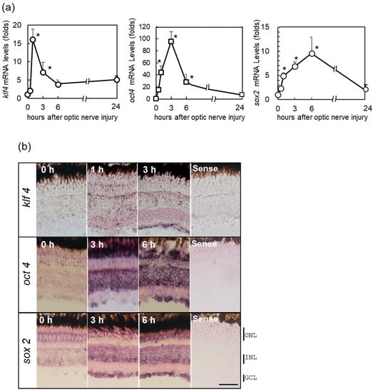 Upregulation of the Yamanaka factors (OSK) in zebrafish retina after ONI. (a) mRNA expression levels of OSK after ONI were determined by quantitative real-time PCR (left, klf4; center, oct4; right, sox2). (b) In situ hybridization of OSK in zebrafish retina after ONI. Klf4 mRNA expression started to increase at 1 h and localized to the GCLs at 3 h after ONI. Oct4 mRNA signal was observed in the GCL and strongly in the INL and ONL at 3 h, but this strong signal was seen in all nuclear layers at 6 h after ONI. Sox2 mRNA expression was observed in all nuclear layers 3 h after ONI and more prominent at 6 h. No positive signals could be seen with the sense probe (Sense). Five to six experiments were repeated with different retinas under each experimental condition and produced the same results. Data are expressed as the mean ± SEM and analyzed by one-way ANOVA, followed by Scheffe’s multiple comparisons. Statistical significance was set at * p < 0.05. Scale bar = 50 μm.
