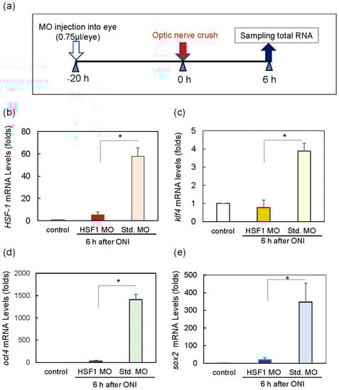 Treatment of HSF1 MO (morpholino) significantly reduced the mRNA expression of Klf4, Oct4, and Sox2 6 h after ONI. (a) HSF1 MO or standard MO (Std. MO) was injected intraocularly 20 h before ONI. (b) HSF1 MO-treated group suppressed HSF1 mRNA expression compared to the Std. MO-treated group. Under these conditions, the mRNA expression of Klf4 (c), Oct4 (d), and Sox2 (e) was inhibited compared to the control (Std. MO) groups. Five experiments were repeated under each experimental condition. Data are expressed as the mean ± SEM of independent experiments and analyzed by one-way ANOVA, followed by Scheffe’s multiple comparisons. Statistical significance was set at * p < 0.05.