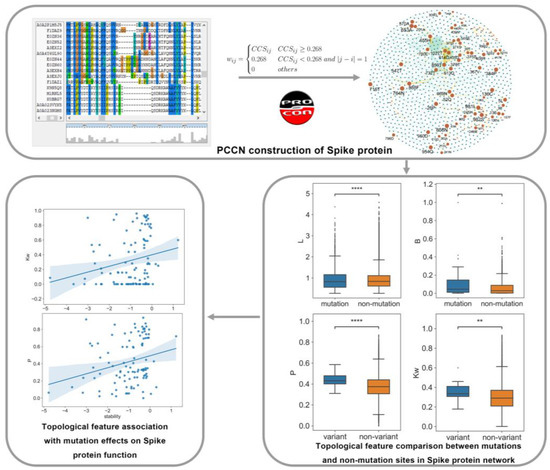 The biological network approach, which is based on local and global topological features of the network, has been extensively used in various biological fields [12], and has also been applied in COIVD-19 related research. Deisy constructed a network medicine framework to identify potentially effective drug candidates [13]. Luisa et al. applied protein contact networks and found that the allosteric modulation region modulates the binding of the spike protein with ACE2 in different conformational states of the spike protein [7,14]. One of the main network-based strategies is to convert a protein into a network to study the structure, function, and dynamics of proteins [15,16,17]. However, most of the network models for protein function study require the 3D structures of proteins that can be experimentally determined, but the process is still laborious and time-consuming. In particular, the emergence of new variants of COVID-19 brings challenges for structure-based network models if the structures from the variants are not determined.