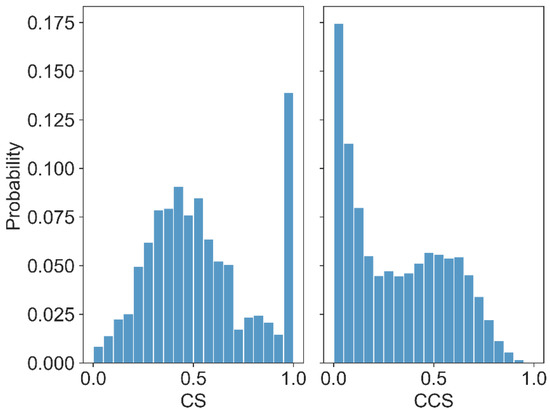 The raw CS that was calculated by ProCon is between 0 and 3, and the CCS between residues is between 0 and 350. The scores were normalized by a min–max normalization method as shown in Equation (1), and they were mapped between 0 and 1:
