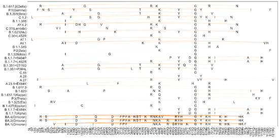SARS-CoV-2 has been confirmed to enter the host cells by contact between its receptor-binding domain (RBD) of the spike (S) protein and angiotensin converting enzyme 2 (ACE2) of the host cell [4,5]. Although substantial progress in clinical research has led to a better understanding of SARS-CoV-2 and the management of COVID-19, many countries have endured several waves of outbreaks due to the emergence of variants [6]. The S protein displays a high degree of genetic variability in the virus genome [7], and its variants make additional close contacts with ACE2, correlating with higher binding affinity and perhaps increased infectivity [8]. For example, the Omicron variant (B.1.1.529) can evade immunity from natural infection or vaccines and increase the risk of reinfections [9,10,11]. Acquiring a comprehensive knowledge of the S protein variants is critical for the determination of a defensive approach against COVID-19.