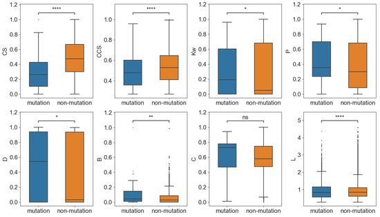 Comparison of the network features of the mutation and non-mutation sites. * p < 0.05; ** p < 0.01; **** p < 0.0001.