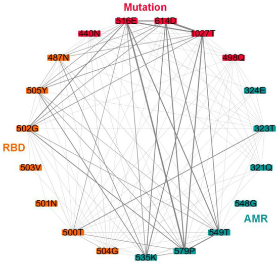 Finally, the top three mutation sites and co-mutation sites with the highest network parameters are listed in Table 1. Several substitutions had more than one high parameter such as 498Q, 440N, 516E, 1027T, and 614D. Then, we investigated these five substitution site relations with their allosteric modulation region (AMR) and RBD and found that 614D and 1027T had more interactions with both AMR and RBD (Figure 5). The results indicate that there was more of a co-conservation tendency among 614D, AMR, and RBD, which may be the reason for the mutation of 614D and will allow for a modulated structural rearrangement for membrane fusion [31] and increase the infectivity and stability of virions [25].