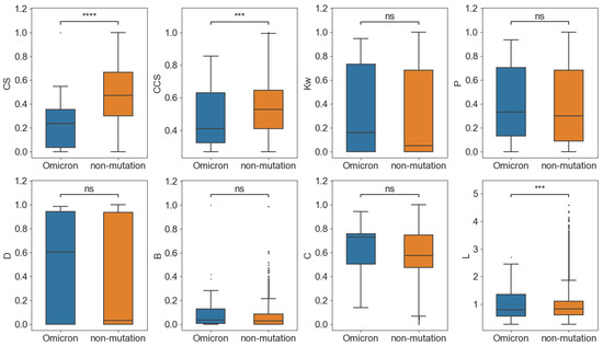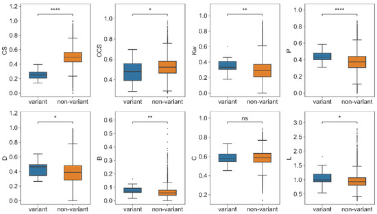 As a result, the variant group also showed significantly higher Kw, P, D, and B than the non-variant group (Figure 6). The results indicated that the mutation sites that occurred on the same variants have high centrality and may play an important role in their conservation. In addition, the CS and CCS of mutation nodes in the variants were significantly smaller than the non-mutation nodes in the non-variant group, which showed that the conservation and co-conservation of mutation nodes were relatively weak at the variant level.