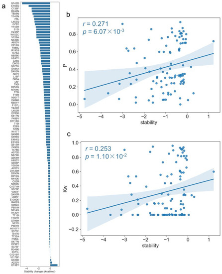 DeepDDG [32] was used to predict the changes in stability for each point mutation and each mutation pair based on the spike protein structure. As shown in Figure 8a, most of the mutations were destabilizing mutations, for example, G142D, E156G, and C136F were the top three mutations that obtained the smallest stability scores, but D138Y obtained the largest positive stability score, which means that the mutation increased the stability. Then, we conducted a correlation analysis between the topological features and the stability changes upon mutations and found that three topological parameters including page rank, average neighborhood weighted degree, and degree centrality were significantly correlated with stability changes (Table S2). In particular, there was a positive correlation between the page rank (P) and stability changes with r = 0.271 and p = 6.07 × 10−3 (Figure 8b). A similar correlation pattern was also found between the average neighborhood weighted degree (Kw) and stability changes, as shown in Figure 8c (r = 0.253 and p = 1.10 × 10−2). The results indicate that if the nodes themselves had a high degree of centrality, high page rank, or their neighbors had a high degree, their mutations tended to destabilize the spike protein.