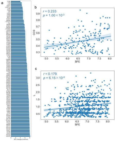 TopNetTree [37] was employed to estimate the BFE changes upon the mutations listed in Table 2 of the SARS-CoV-2 spike protein with ACE2 (PDB: 7A98 [38]). As shown in Figure 9a, all of the mutations increased the BFE between the spike glycoprotein and ACE2. The changes in BFE were significantly negatively correlated with the closeness centrality with the p-value of 0.045 and the coefficient of −0.207. Next, we analyzed the co-mutation effects on the spike protein. The correlation of the shortest path length and CCS between two mutations with the BFE changes of the two mutations were calculated, respectively. As shown in Figure 9b,c, the BFE changes were significantly positively correlated with CCS (r = 0.233 and p = 1.00 × 10−3) and shortest path length (r = 0.179 and p = 6.15 × 10−8) from the two mutation sites. The results demonstrate that if the two mutation sites have the tendency of high co-conservation or larger distance, they might induce larger BFE changes. Moreover, the top three co-mutation pairs with the largest BFE were D215G–D614G, S371F–D614G, and D614G–T732A. Notably, D614G was involved in all of them, which has been reported to have an important impact on infectivity [21,22,23,24,25,26,27]; although it is not in the RBD, it has an important impact on BFE. The results indicate that our PCCN model based on sequence information could also reflect the mutation effects on the binding affinity changes between the spike protein and ACE2. The detailed correlation parameters are listed in Table S3.