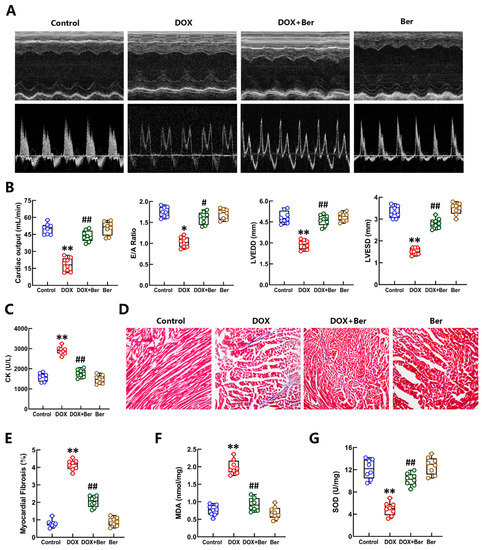2.1. The Effect of Ber on Preventing DOX-Induced Cardiac Diastolic Dysfunction and Fibrosis Is Associated with Alleviating Oxidative Stress